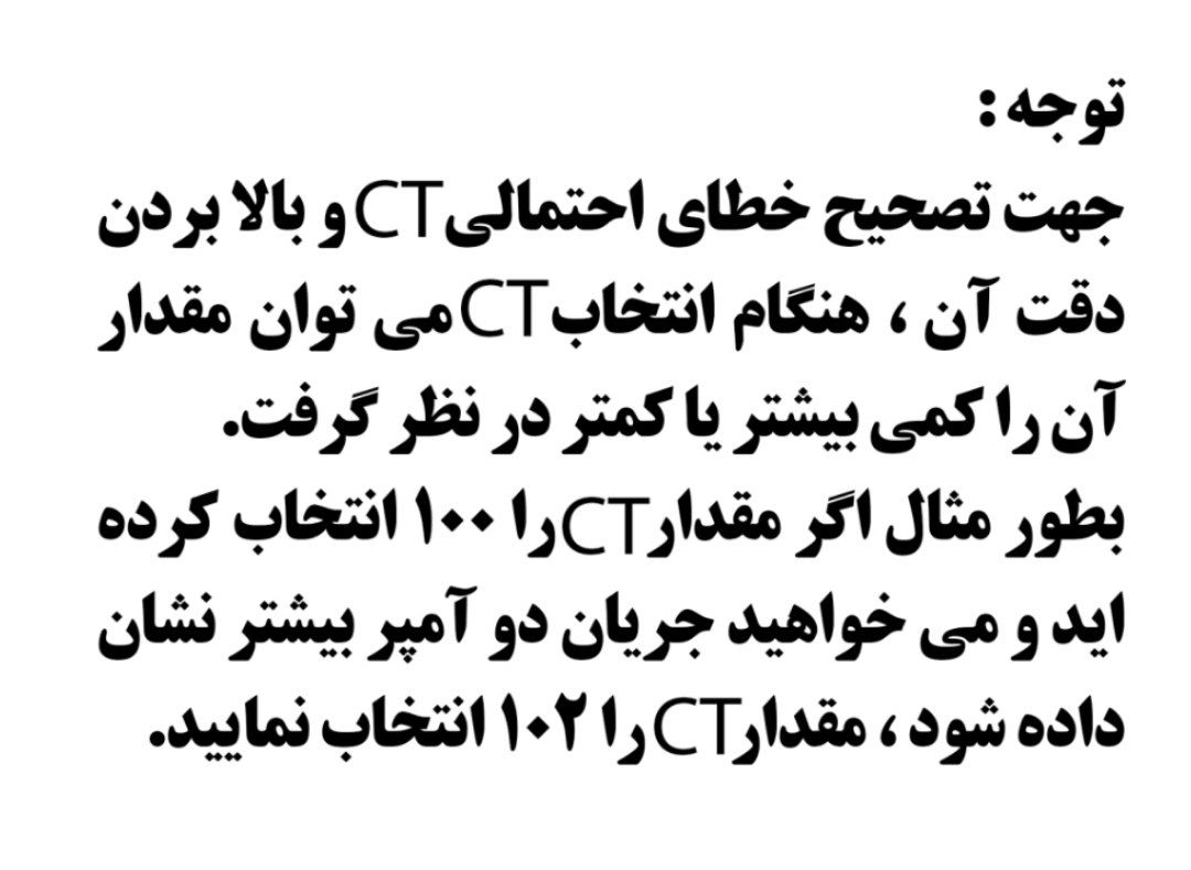 با نگه داشتن کلید اینتر و فلش پایین به مدت ۳ثانیه وارد تنظیمات سی تی شده و به طور مثال اگر مقدار سی تی را ۱۰۰ انتخاب کرده اید و میخواهید جریان دو آمپر بالاتر نمایش داده شود مقدار سی تی را ۱۰۲ انتخاب نمایید.